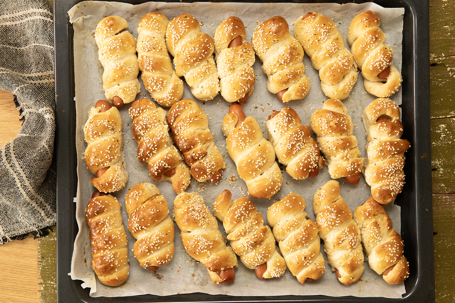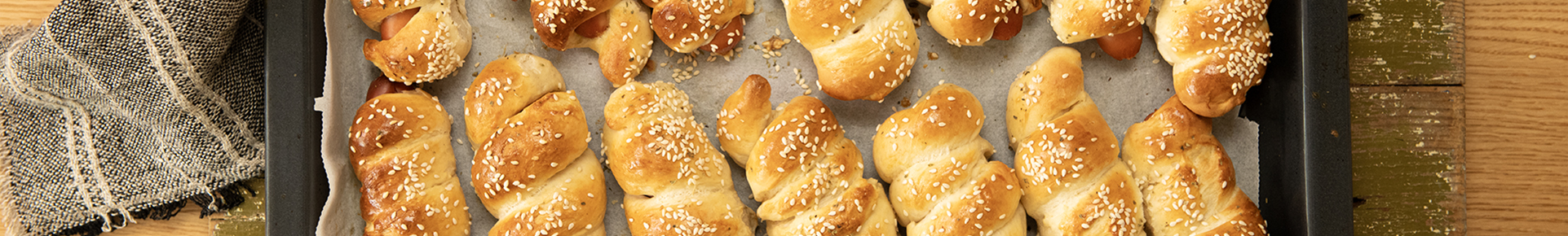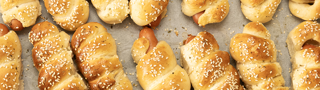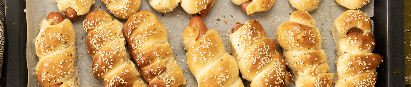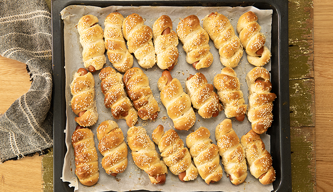 След това тестото се разделя на 24 части, като всяка една се оформя на топка, а след това на лента и се увива около кренвирш, намазан с горчица.