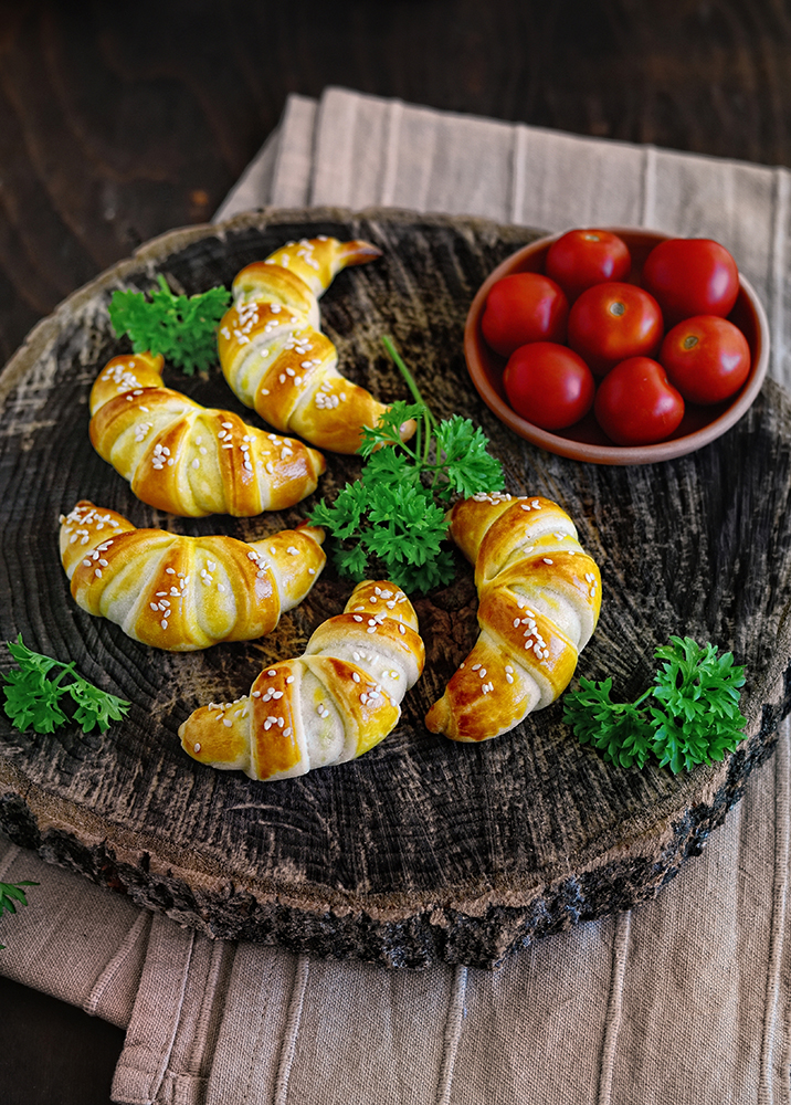 Готовото тесто разделете на 5 равни части. Всяка част, разточете на кръгъла кора. Всяка кора нарежете на 8 части и оформете от всяка част малка кифличка, в която поставяйте по една супена лъжица от плънката. Готовите кифлички, наредете върху предварително приготвените тави за печене. Покрийте ги с найлоново фолио за 20 минути, за да втасат отново.