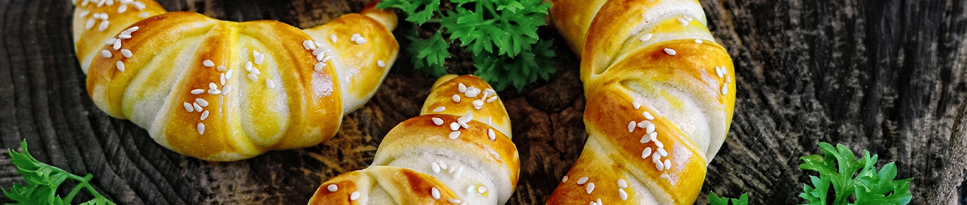 Разбийте заделения жълтък с една чаена лъжичка прясно мляко и намажете с четка кифличките по повърхността. Поръсете със сусам и печете във фурна на 180⁰С за 25-30 минути.