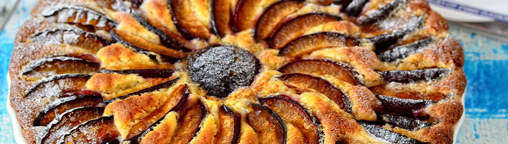 Разпределете тестото в подходяща форма за печене на 3/4 от обема и. Върху тестото наредете наряза-ните сини сливи, като ги притиснете леко в тестото.