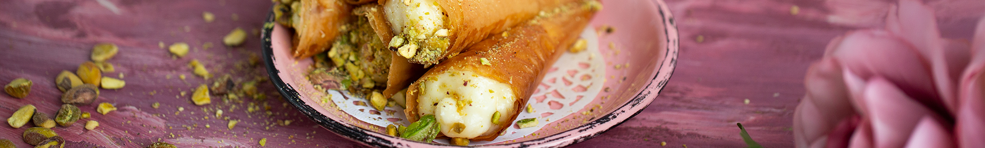 Намажете кора за баница до половината с разтопено масло. Сгънете на две. Разрежете на две части по дължина всяка от двете части. След това разрежете всяка дълга част на три по дължина, така че да се получат три квадрата. Навийте всеки квадрат около метални фунийки. Изрежете стърчащите крайчета и намажете с масло, с помощта на четка, там, където се стърчат някакви части. Идеята е да прилепнат добре.