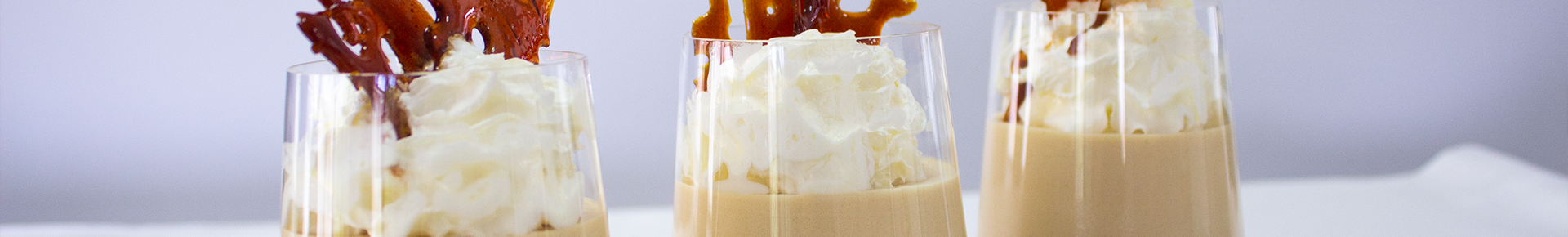Кремът се сервира със сметана и се декорира с фигурите карамел.