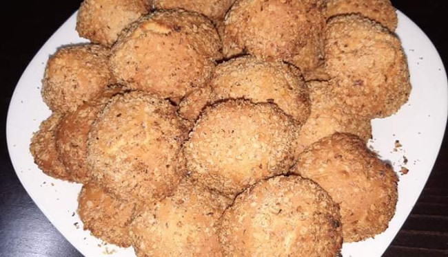 2. От полученота кейкова смес се гребва с чаена лъжичка и с помощта на вилица се освобождава парчето тесто в орехите, овалваме хубаво в орехите и редим в тава, която не е намазнена.