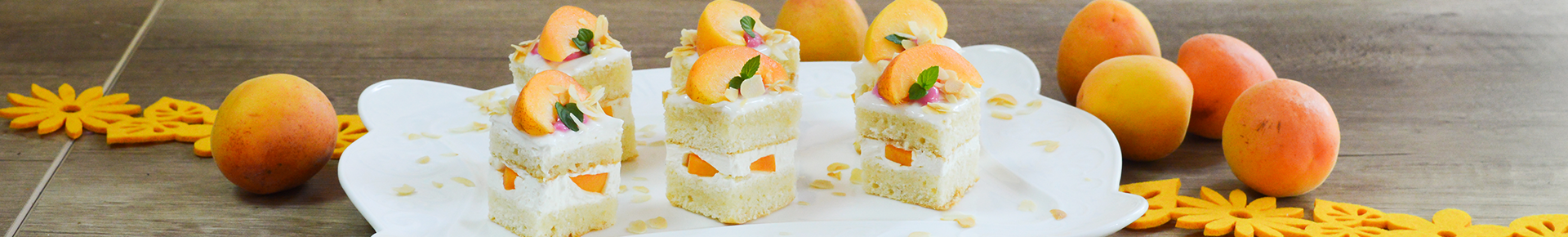 Добре охладеният блат се разделя на две еднакви парчета, между които се намазва 2/3 от сметановия крем. Върху горния слой се намазва останалата сметана и се прибира в хладилника да стегне. След 2-3 часа сладкишът се разрязва на малки петифури и се украсява с парченца кайсия и филирани ядки.