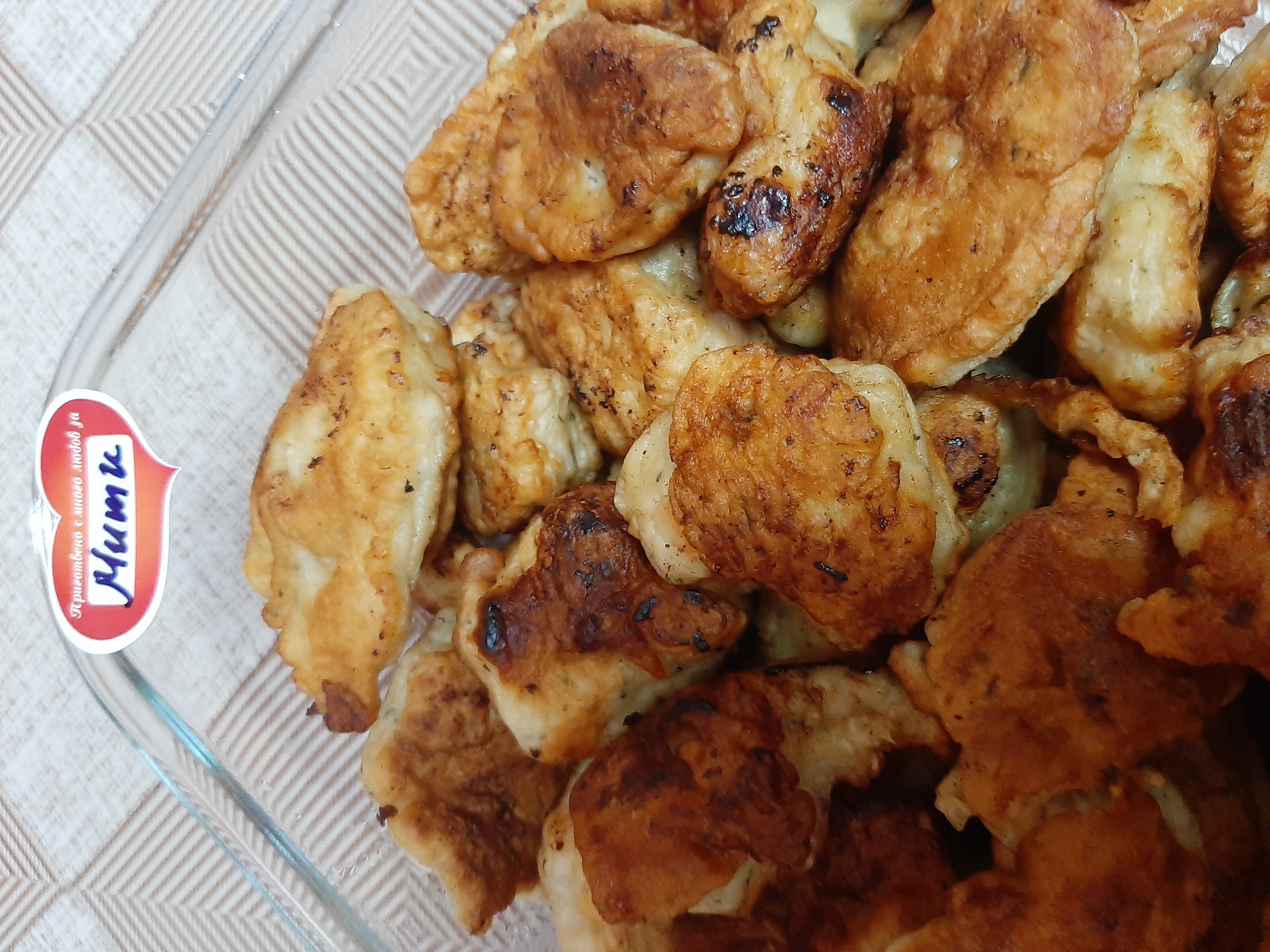 1. В дълбока купа се разбъркват всички продукти и към тях се прибавят парченцата месо. Получава се каша.