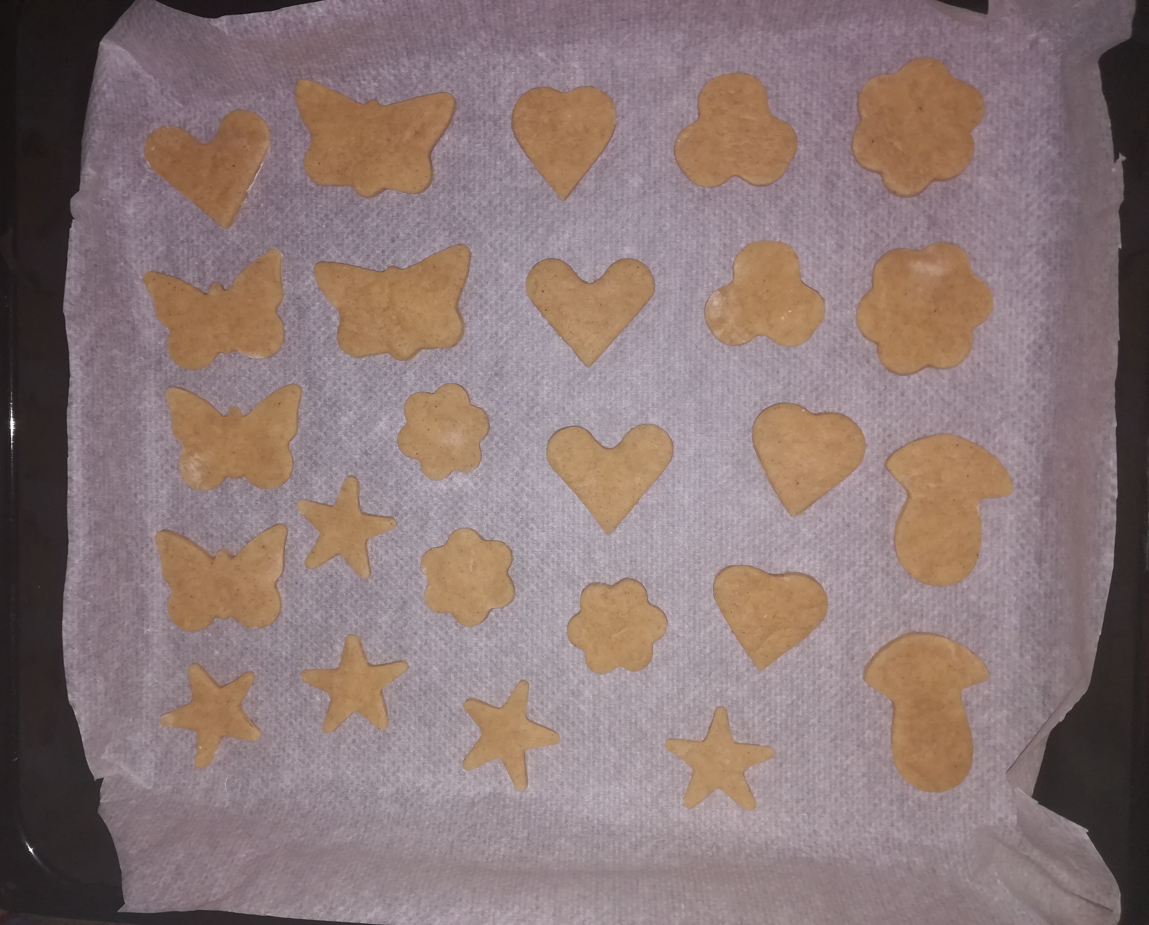 4. В тава с хартия за печене нареждаме сладките и печем в предварително загрята фурна на 180°.