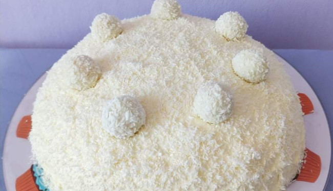 9. След това разпределете от крема. Разпределете всички съставки така докрай, като запазвате една част от крема, която да смесите с разбитата сладка сметана. С тази по-лека и пухкава глазура измажете тортата, а след това покрийте с още кокосови стърготини.