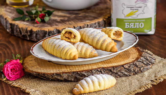 Тестото разделете на парчета по 30 грама всяко. Всяко парче оформете на топче и го притиснете към къдрав нож за рязане на кашкавал, за да получите вълнообразна форма. По средата на тестото по дължина, още докато тестото е върху ножа, поставете 1 чаена лъжичка от плънката и притиснете двата края, за да запечатите сладката. Така оформеното тесто, поставете върху тава покрита с хартия за печене. Печете сладките за 17-20 минути, докато станат леко златисти по повърхността. Оставете ги да изтинат, защото са много крехки, докато са топли.